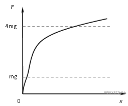 Период малых вертикальных колебаний груза массой m, подвешенного на резиновом жгуте, равен Зависимость силы упругости резинового жгута F от удлинения х изображена на графике.